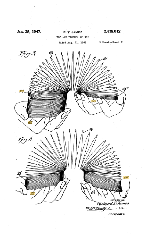 We must include the most famous spring patent, US2415012A, for a toy and process of use, better known as the Slinky.